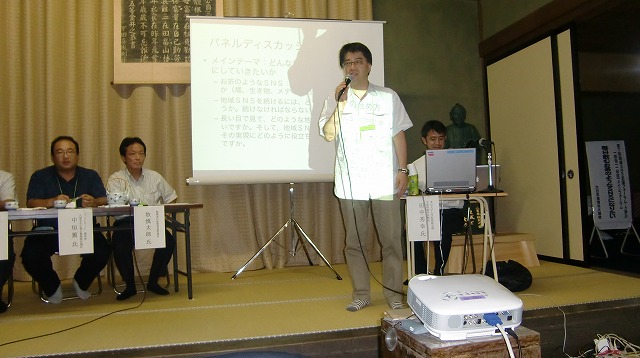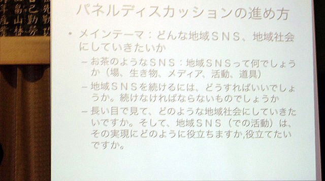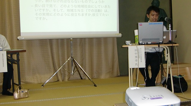テーマ: 「毎日飲むお茶のようなSNSになりたい」 事例発表による「より身近なe-コミュニティ」についてディスカッション パネラー 総務省行政管理局 管理官 牧慎太郎 氏 「つつじネット」久留米市広報広聴課 課長補佐 中垣篤 氏 「お茶っと」宇治市総務課 次長 中村 俊二 氏 「モリオネット」岩手大学情報メディアセンター准教授 吉田等明 氏 「e-じゃん掛川」NPO法人スローライフ掛川顧問 釧路市副市長 小松正明 氏 東京大学大学院学際情報学府博士課程 畑仲哲雄 氏 |