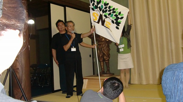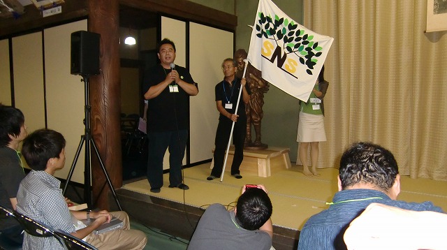 地域SNS旗を福井へ 団長さんが地域SNS旗について説明 この旗は3ん前の第1回地域SNSフォーラムin神戸に参加したときに持って行ったものです。 団長さん宅のテーブルクロスにまあねっとさんがデザインして布を切りぬいて作成したものです。 SNSの樹に枝葉が広がっていきます。 この旗が第1からずっと7回まで引き継がれてきています |