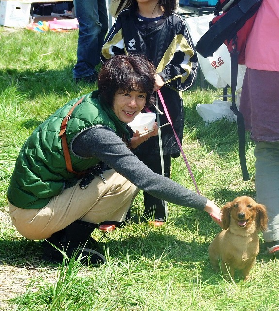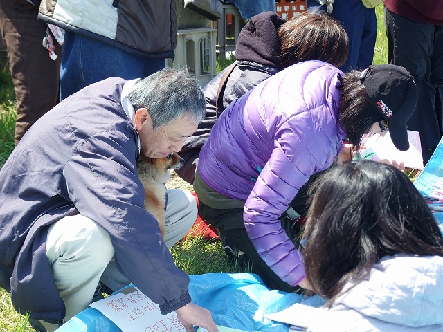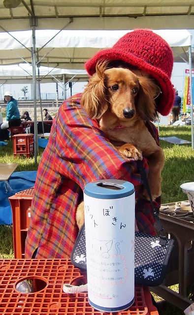 ペット募金の募金箱を前にマルちゃんを抱っこして。